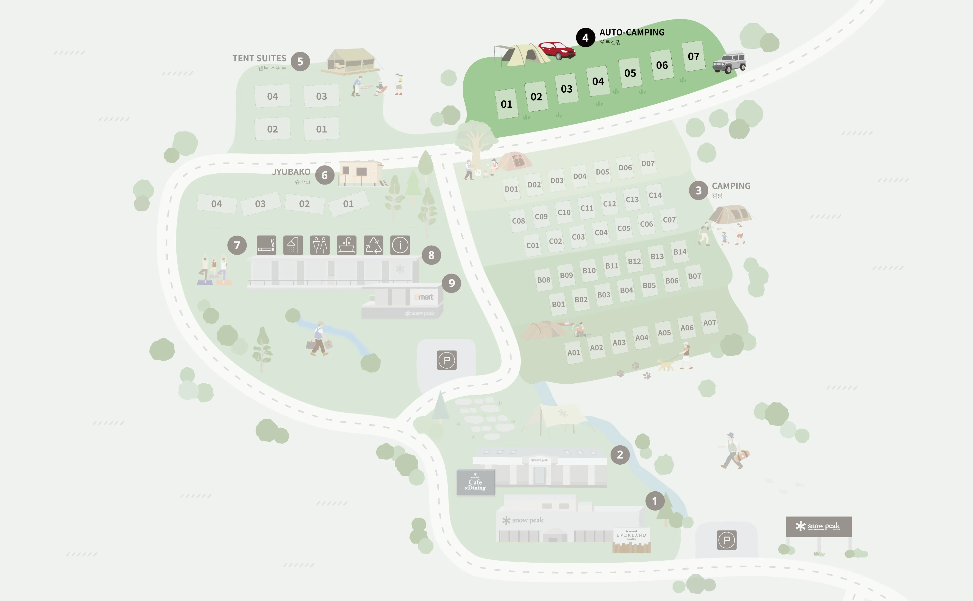 캠프필드 가장 안쪽, 고지대에 자리하고 있는 오토캠핑 구역은 한적한 자연 속에서 프라이빗하게 시간을 보낼 수 있는 구역입니다.